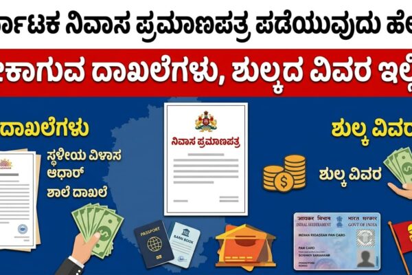 ಕರ್ನಾಟಕದಲ್ಲಿ ವಾಸಿಸುವ ಪ್ರತಿಯೊಬ್ಬ ನಾಗರಿಕನಿಗೂ ನಿವಾಸ ಪ್ರಮಾಣಪತ್ರ (Residence Certificate/Domicile Certificate) ಅತ್ಯಗತ್ಯವಾದ ದಾಖಲೆಯಾಗಿದೆ. ಶಿಕ್ಷಣ ಸಂಸ್ಥೆಗಳಲ್ಲಿ ಸೀಟು ಪಡೆಯಲು, ಸರ್ಕಾರಿ ಉದ್ಯೋಗಗಳಿಗೆ ಅರ್ಜಿ ಸಲ್ಲಿಸಲು ಅಥವಾ ವಿವಿಧ ಸಮಾಜ ಕಲ್ಯಾಣ ಯೋಜನೆಗಳ ಲಾಭ ಪಡೆಯಲು ಈ ಪತ್ರ ಬಹಳ ಮುಖ್ಯ. ಈ ಲೇಖನದಲ್ಲಿ ಕರ್ನಾಟಕ ನಿವಾಸ ಪ್ರಮಾಣಪತ್ರವನ್ನು ಪಡೆಯುವ ವಿಧಾನ, ಬೇಕಾಗುವ ದಾಖಲೆಗಳು ಮತ್ತು ಶುಲ್ಕದ ಸಂಪೂರ್ಣ ವಿವರಗಳನ್ನು ಸರಳವಾಗಿ ನೀಡಲಾಗಿದೆ. ನಿವಾಸ ಪ್ರಮಾಣಪತ್ರ ಎಂದರೇನು? ಒಬ್ಬ ವ್ಯಕ್ತಿಯು ಒಂದು ನಿರ್ದಿಷ್ಟ ರಾಜ್ಯದಲ್ಲಿ ಅಥವಾ ಪ್ರದೇಶದಲ್ಲಿ…