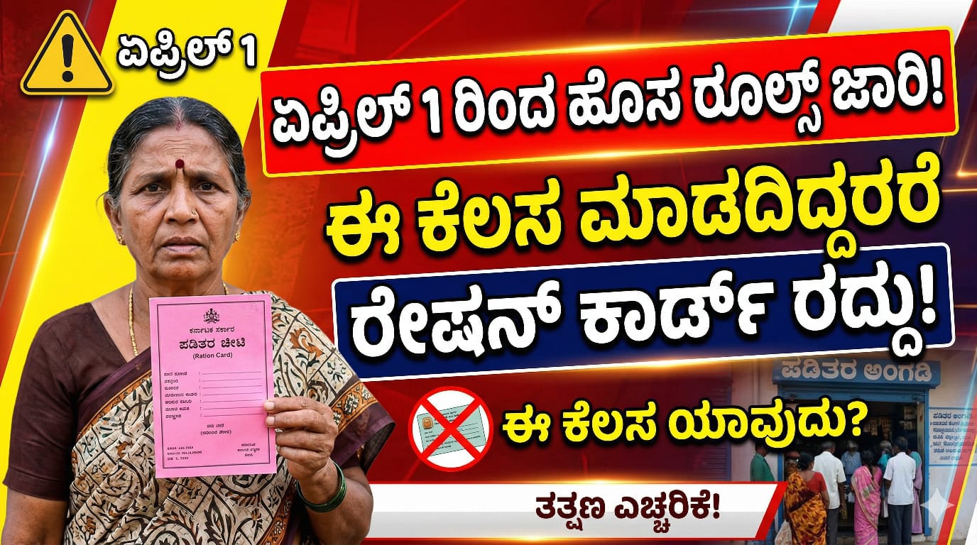 ಒಂದು ವೇಳೆ ನೀವು ಈ ಕೆಳಗಿನ ಕೆಲಸಗಳನ್ನು ಪೂರ್ಣಗೊಳಿಸದಿದ್ದರೆ, ನಿಮ್ಮ ರೇಷನ್ ಕಾರ್ಡ್ ರದ್ದಾಗುವ ಅಥವಾ ತಾತ್ಕಾಲಿಕವಾಗಿ ಅಮಾನತುಗೊಳ್ಳುವ ಸಾಧ್ಯತೆ ದಟ್ಟವಾಗಿದೆ. ಈ ಲೇಖನದಲ್ಲಿ ಏಪ್ರಿಲ್ 1ರಿಂದ ಜಾರಿಯಾಗಲಿರುವ ಹೊಸ ನಿಯಮಗಳೇನು ಮತ್ತು ನೀವು ಮಾಡಬೇಕಾದ ಕೆಲಸಗಳೇನು ಎಂಬುದನ್ನು ವಿವರವಾಗಿ ತಿಳಿಯೋಣ.