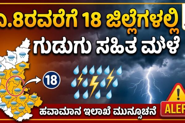 ಬೇಸಿಗೆಯ ಬಿಸಿಲಿನಿಂದ ಕಂಗೆಟ್ಟಿರುವ ಕರ್ನಾಟಕದ ಜನತೆಗೆ ಸಿಹಿಸುದ್ದಿ. ಏಪ್ರಿಲ್ 8ರವರೆಗೆ ರಾಜ್ಯದ 18 ಜಿಲ್ಲೆಗಳಲ್ಲಿ ಗುಡುಗು, ಮಿಂಚು ಸಹಿತ ಮಳೆಯಾಗುವ ಕುರಿತು ಹವಾಮಾನ ಇಲಾಖೆ (IMD) ಮುನ್ಸೂಚನೆ ನೀಡಿದೆ. ಯಾವೆಲ್ಲಾ ಜಿಲ್ಲೆಗಳಲ್ಲಿ ಮಳೆಯಾಗಲಿದೆ? ಇಲ್ಲಿದೆ ಸಂಪೂರ್ಣ ವರದಿ. ರಾಜ್ಯದ 18 ಜಿಲ್ಲೆಗಳಲ್ಲಿ ಗುಡುಗು ಸಹಿತ ಭಾರಿ ಮಳೆ: ಹವಾಮಾನ ಇಲಾಖೆ ಎಚ್ಚರಿಕೆಬೇಸಿಗೆಯ ಬಿಸಿಲಿನ ಬೇಗೆಯಿಂದ ಕಂಗೆಟ್ಟಿರುವ ಕರ್ನಾಟಕದ ಜನತೆಗೆ ಭಾರತೀಯ ಹವಾಮಾನ ಇಲಾಖೆ (IMD) ತಂಪಾದ ಸುದ್ದಿಯೊಂದನ್ನು ನೀಡಿದೆ. ರಾಜ್ಯದಲ್ಲಿ ವಾತಾವರಣ ದಿಢೀರ್ ಬದಲಾವಣೆಯಾಗಿದ್ದು, ಏಪ್ರಿಲ್ 8ರವರೆಗೆ…